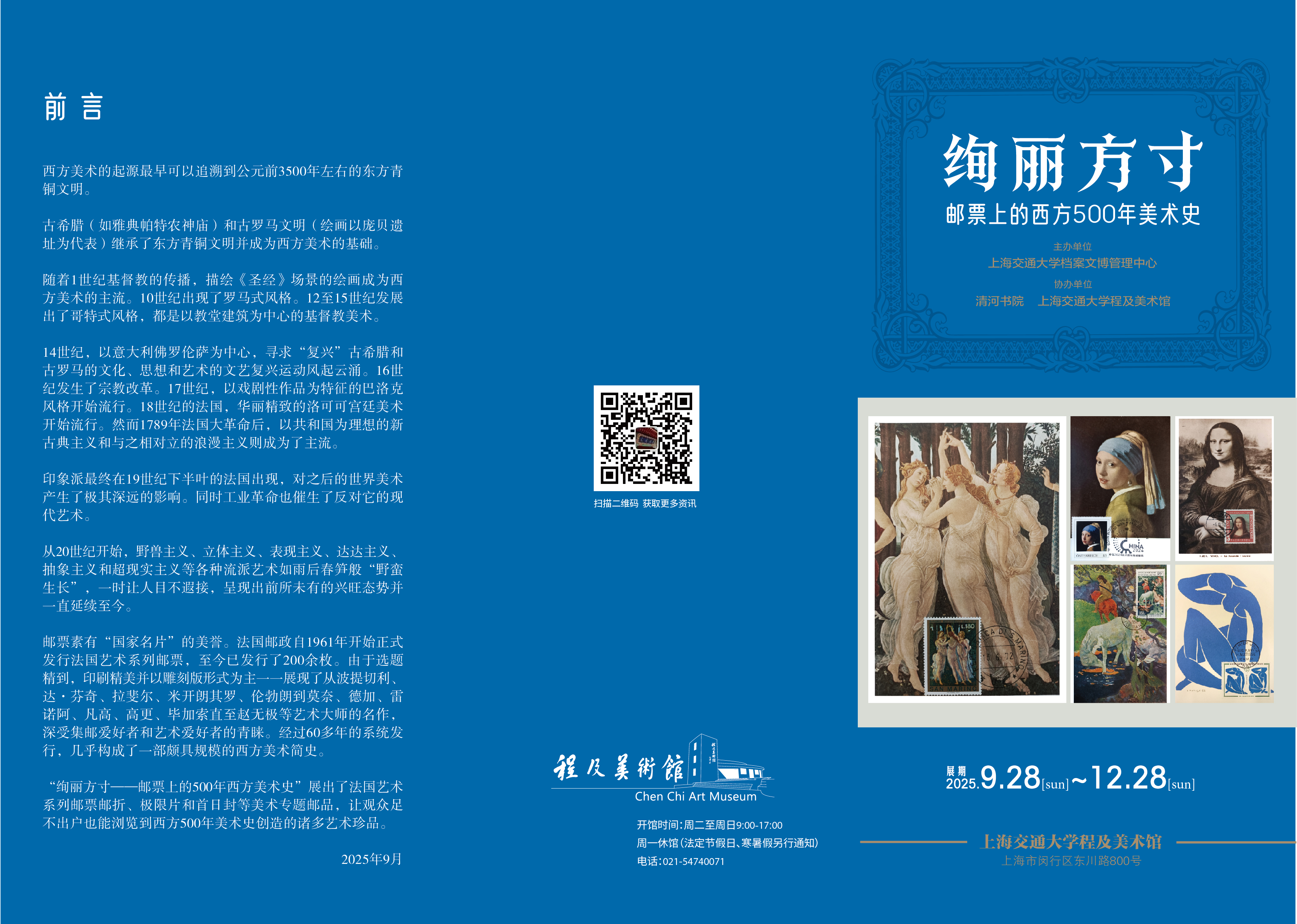2025年9月28日,“绚丽方寸一一邮票上的西方500年美术史”展,在上海交通大学程及美术馆开幕,展出了各国邮政发行的从波提切利、达芬奇、拉斐尔、莫奈、梵高、高更、毕加索到赵无极等68位艺术大师绘画作品邮品(邮票、邮折、极限片、首日封等)近200件,堪称是一部西方500年美术简史。以“国家名片”这种独特的方式走进高等学府,普及高雅艺术,让西方艺术大师与莘莘学子零距离接触,无疑是件极有深意的事,也因此而受到师生的广泛赞誉。