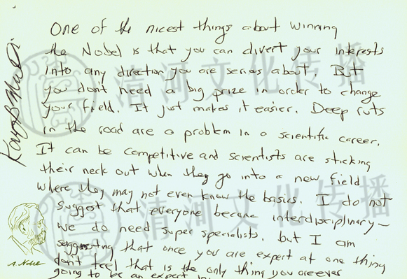 | 译文: 折桂诺贝尔犹如捷径,使您兴之所至转向研究领域变得简单。但并非巨奖才能助您改变,只是得此殊荣如锦上添花。根深蒂固的旧观念是科学道路上的一大阻碍。所以科学家在前无古人的新领域中进行探索,是极具竞争力和挑战性的。我并不主张科学家人人都要跨领域研究,因为我们的确需要深层次的专业人士。但是我建议,即使你成为了某一方面的专家,你也不要单领域研究到底。 |
