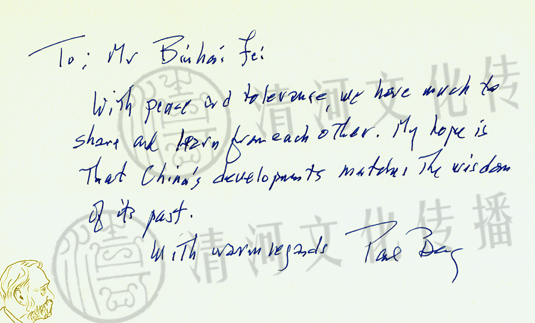 译文:有了和平与宽容,我们能彼此分享和互相学习。我希望中国的发展能借鉴受益于先人的智慧!