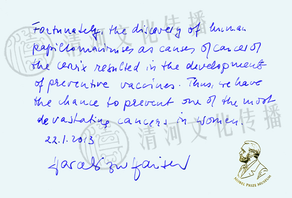 表彰其发现人类乳突淋瘤病毒导致子宫颈癌机理。