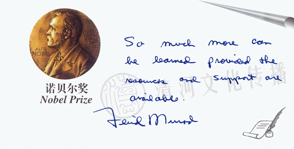 | 题词 译文:您致力于在亚洲建立一个诺贝尔博物馆不仅仅明显是一个巨大的工程,更是一个极其重要的事业,能够告知公众技术的进步以及科学如何改善提高卫生保健及生命质量。此外,它无疑将影响和激发年轻学生,而他们正代表了我们对未来重要的投资和馈赠。获得诺贝尔奖这项殊荣同时也给对全世界科学、教育及和平大使都带来了巨大的责任。这些责任可能是诺贝尔奖获奖者所应承担的最高奖赏。 |