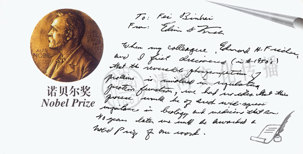 | 译文:当我的同事埃德蒙·A·费希尔和我在50年代首次发现蛋白质的可逆磷化作用属于常规蛋白质功能时,我们就意识到这种作用在生物学和医学上有着非常广泛的重要性,四十多年后我们会由此而获得诺贝尔奖。 |
