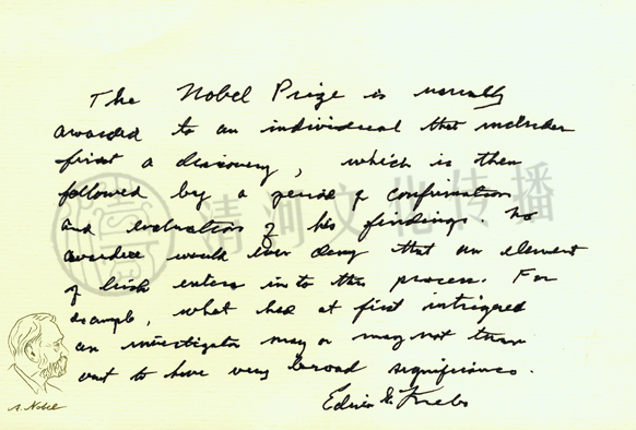 | 译文:诺贝尔奖通常颁发给其发现得到日后证实和评估的个人。没有一个获奖者会否认这个过程有幸运的成分存在。比如,最先激起获奖者探索兴趣的事物有着十分重要的意义,这种情况是否发生并非必然。 |